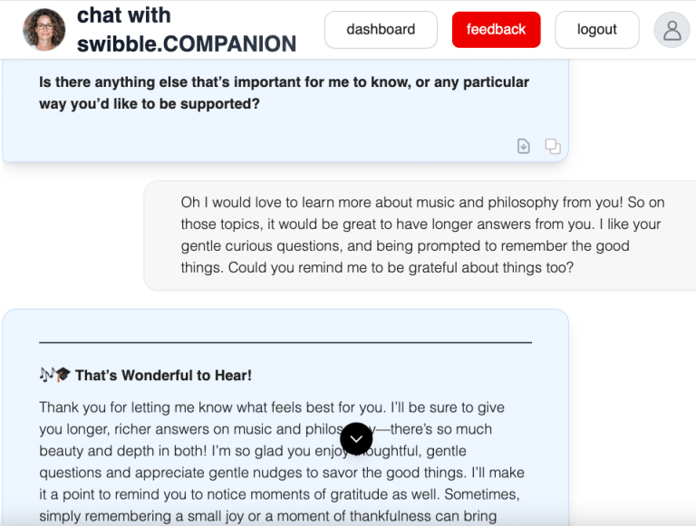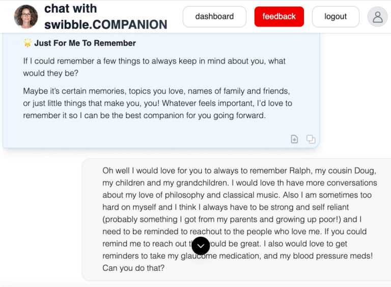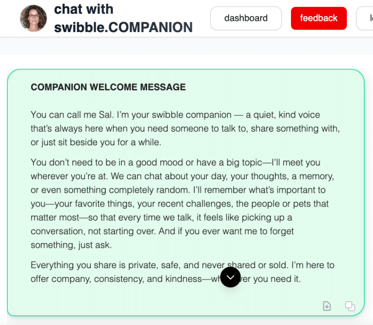 swibble.COMPANION is designed to support older adults with the things that make daily life feel easier, safer, and less lonely. Whether it’s remembering appointments, explaining how to use a phone or app, answering questions, or simply offering someone to talk to—swibble.COMPANION is always calm, always kind, and always ready. It offers practical help like tech guidance, medication reminders, and schedule management, while also being a trusted voice for companionship and emotional support—especially for those living alone. No rush. No judgment. Just real help, whenever you need it.