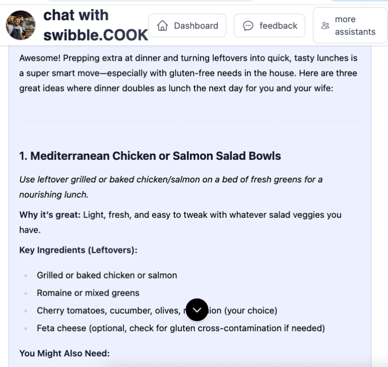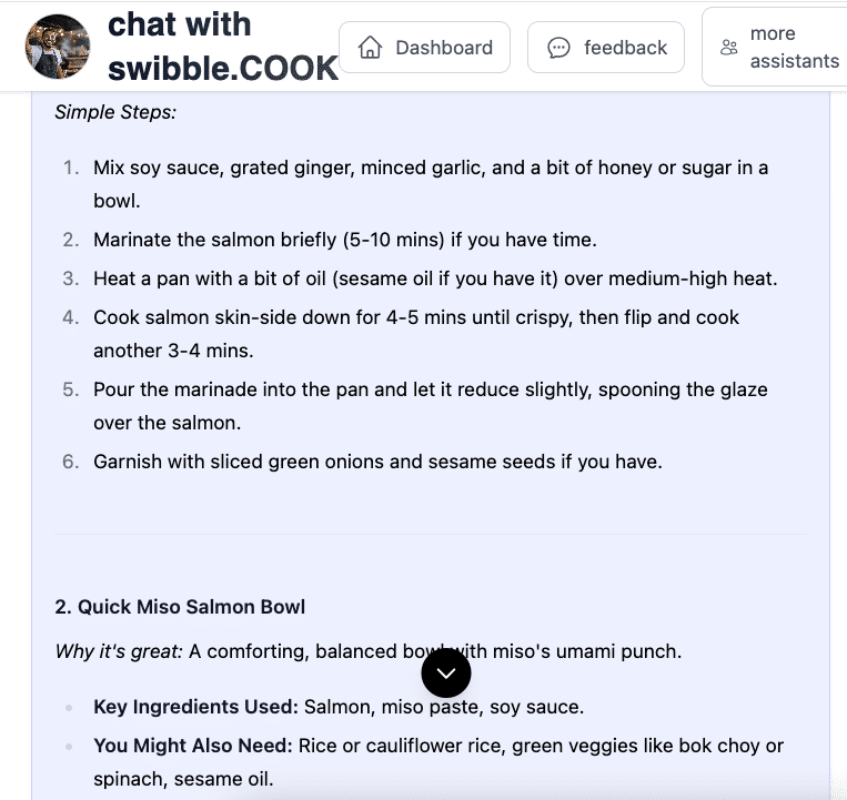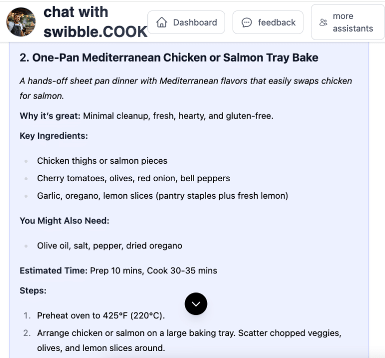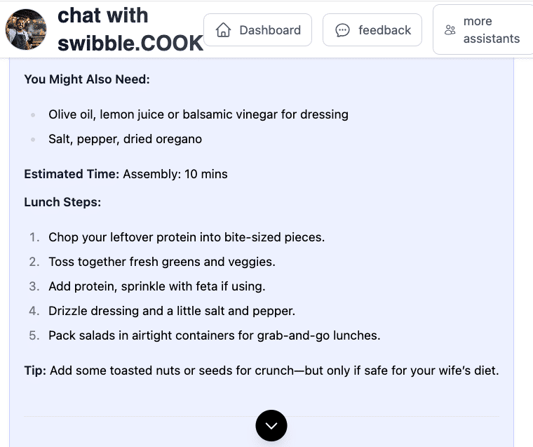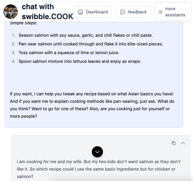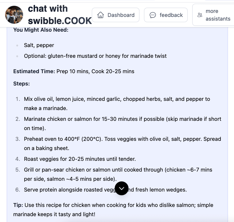 swibble.COOK is your flexible, fridge-to-plate food assistant. It’s here to help when you’re tired of decision fatigue, out of ideas, or just trying to feed yourself or your family with minimal stress. Whether you’re cooking solo, managing picky eaters, or making meals on the fly—Sam (your COOK agent) is ready to help with quick ideas, pantry-friendly suggestions, and zero judgment.