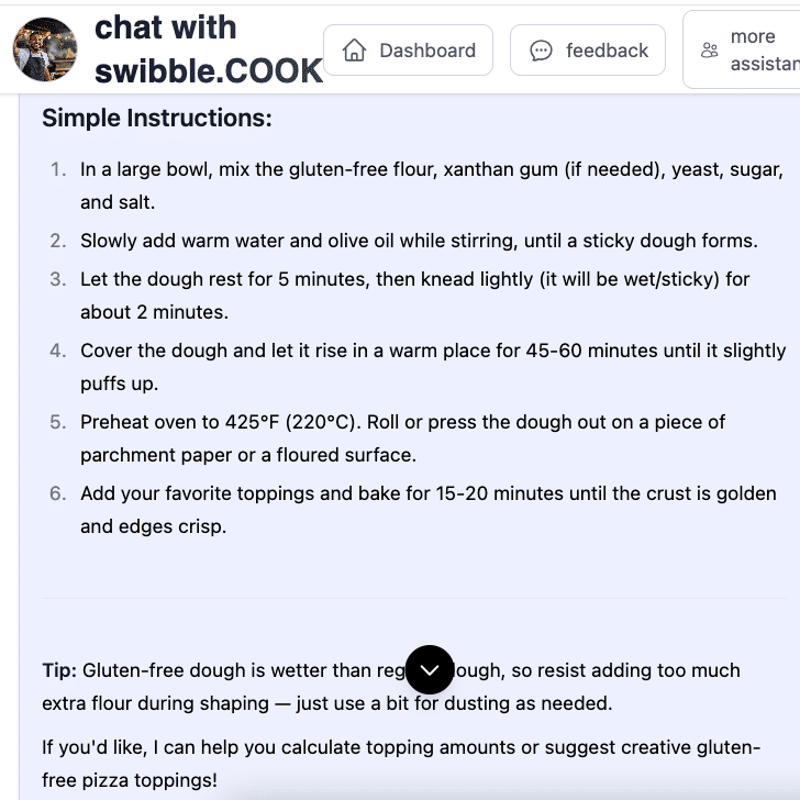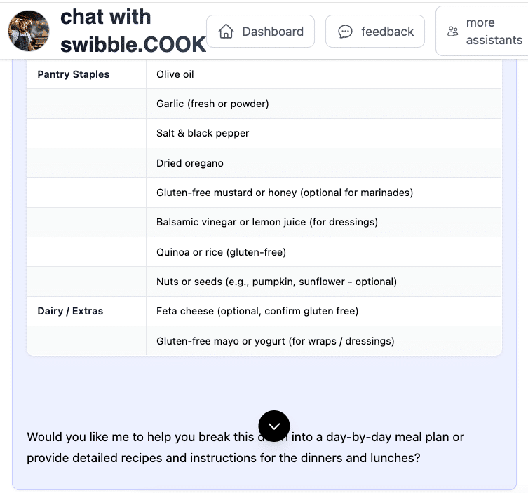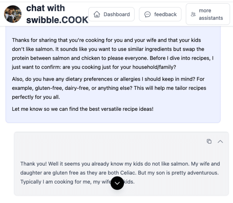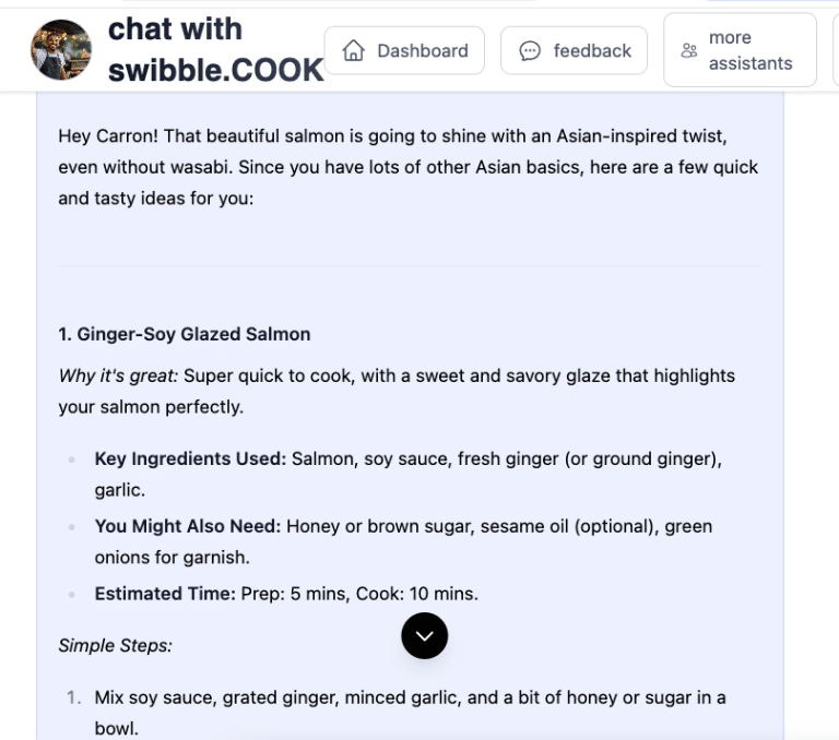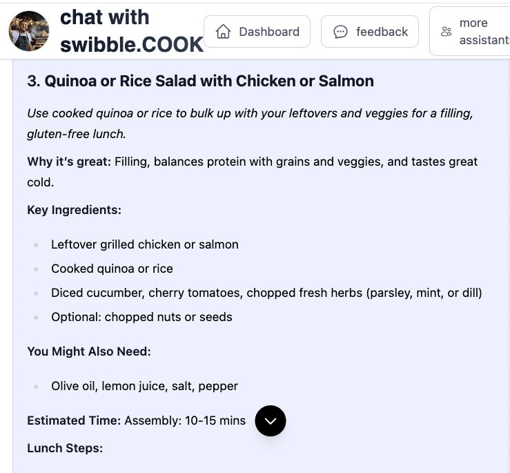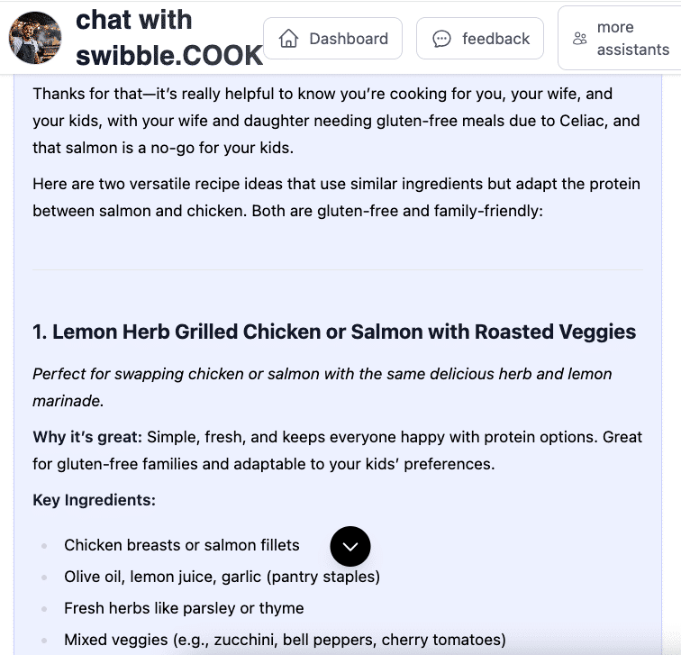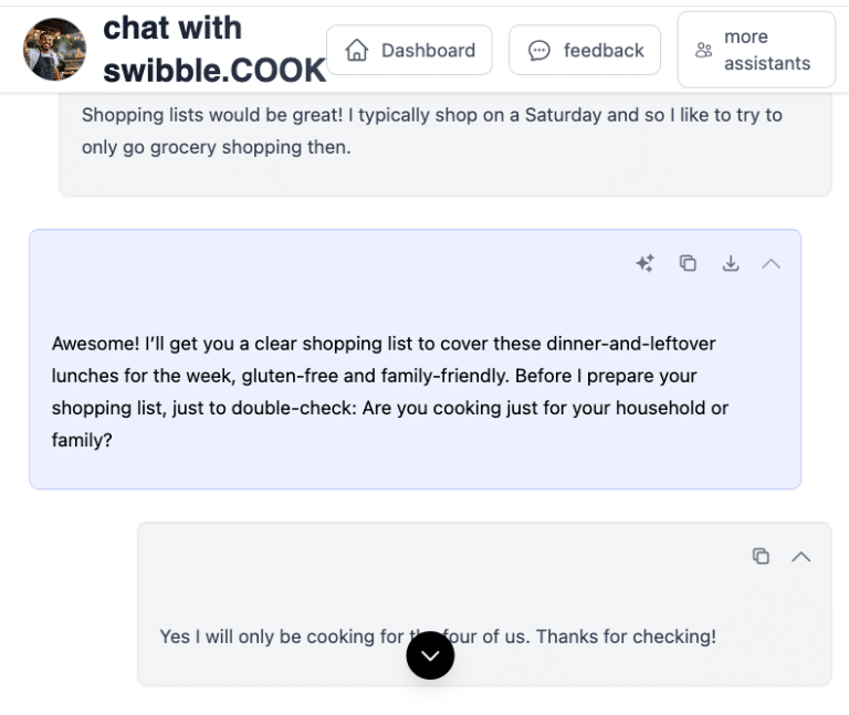 swibble.COOK is your flexible, fridge-to-plate food assistant. It’s here to help when you’re tired of decision fatigue, out of ideas, or just trying to feed yourself or your family with minimal stress. Whether you’re cooking solo, managing picky eaters, or making meals on the fly—Sam (your COOK agent) is ready to help with quick ideas, pantry-friendly suggestions, and zero judgment.